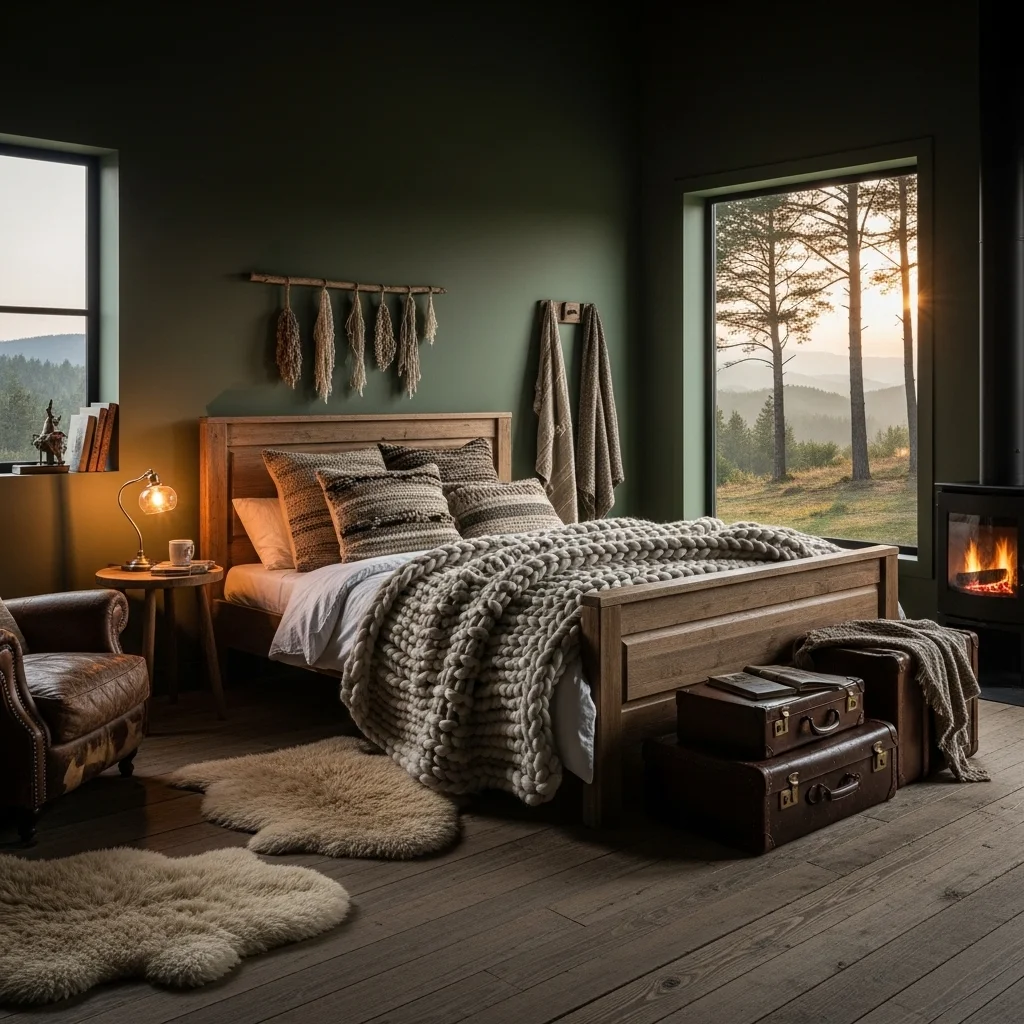 In a rustic bedroom, dark green walls paired with wooden furniture and woven textiles create warmth and authenticity. The space feels comfortable and welcoming, similar to a peaceful countryside retreat.