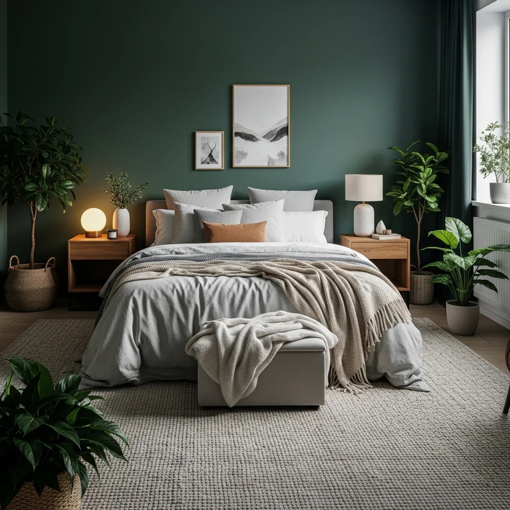 Neutral bedding helps soften the boldness of dark green walls. Shades like beige, cream, ivory, or soft gray provide a calming contrast that keeps the room balanced and inviting.