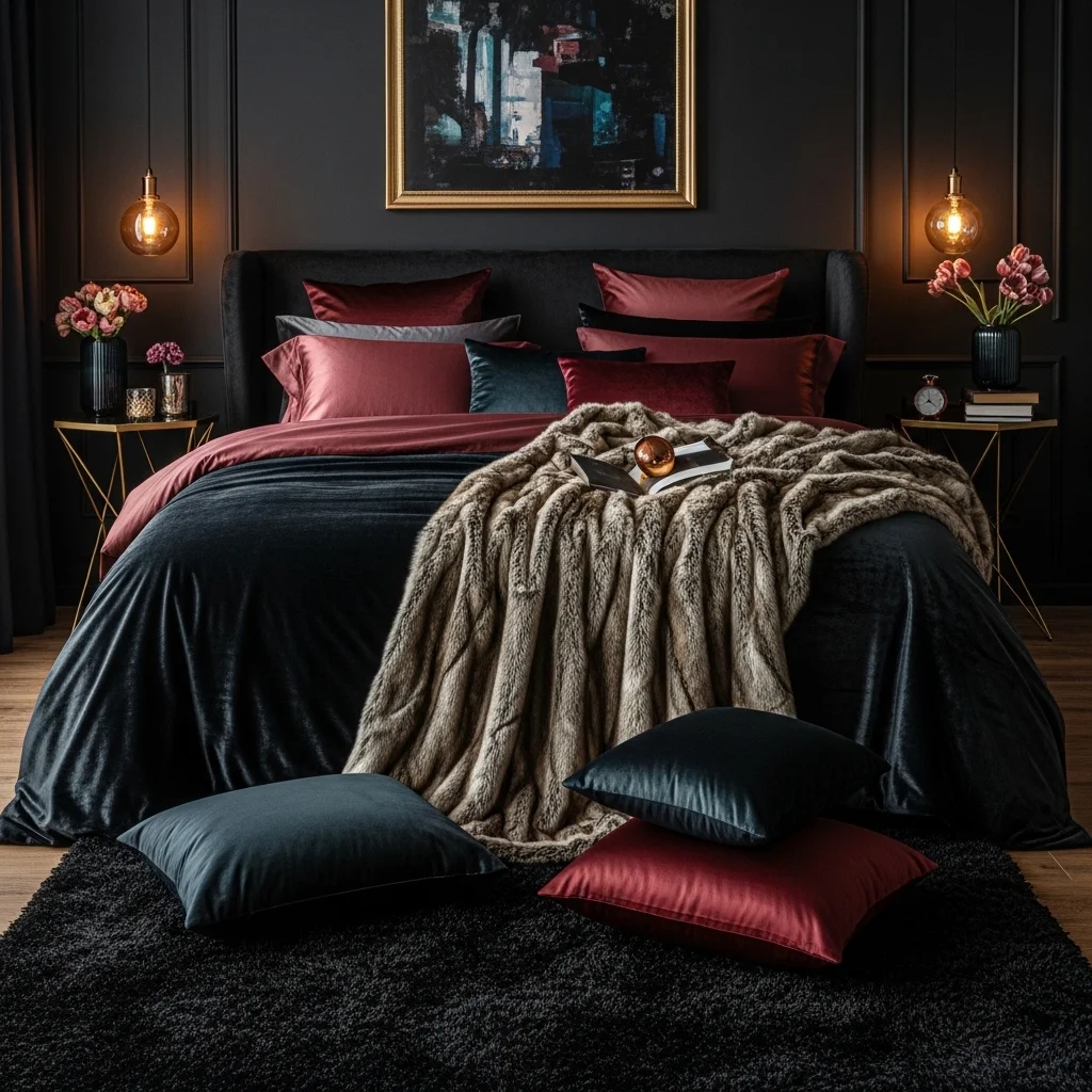 A dark feminine bedroom is all about balance. Deep shades such as black, plum, emerald green, and burgundy create a powerful visual statement, while soft textures like velvet, satin, and faux fur maintain a sense of warmth and comfort. The result is a space that feels romantic, cozy, and sophisticated at the same time.