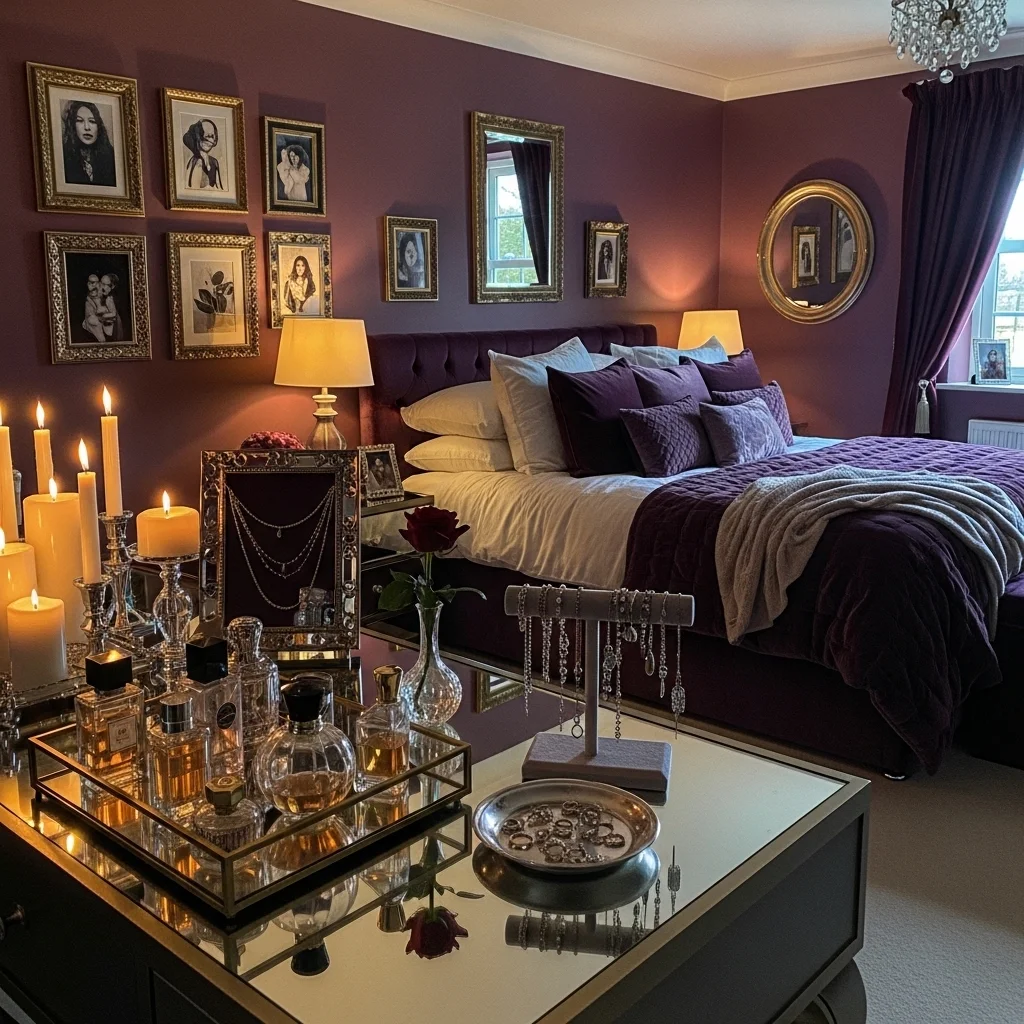 Large mirrors are both practical and decorative. They reflect light around the room, making darker spaces feel more open and balanced. Ornate mirrors with gold or antique frames complement the luxurious feel of the dark feminine aesthetic.