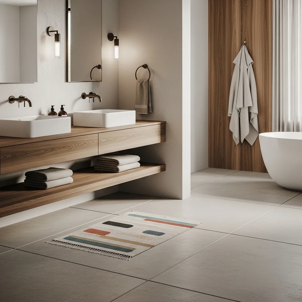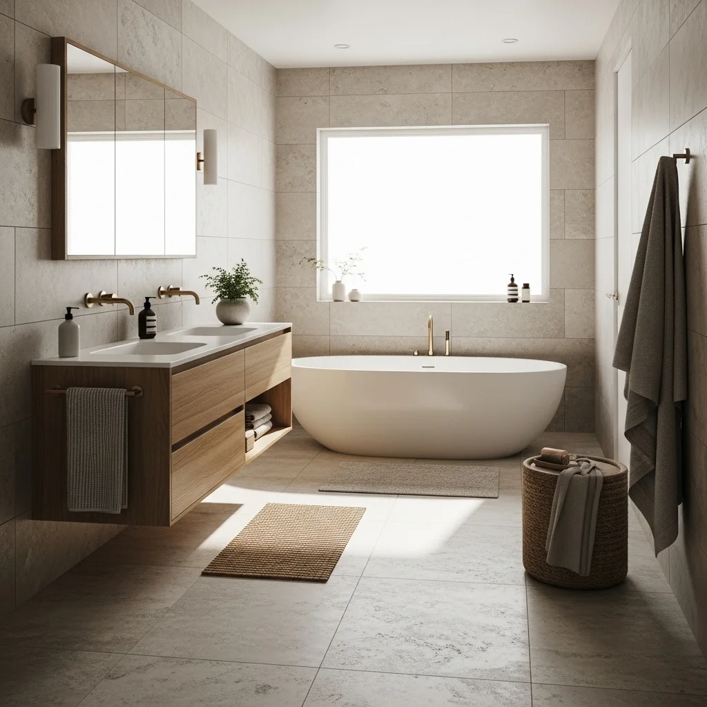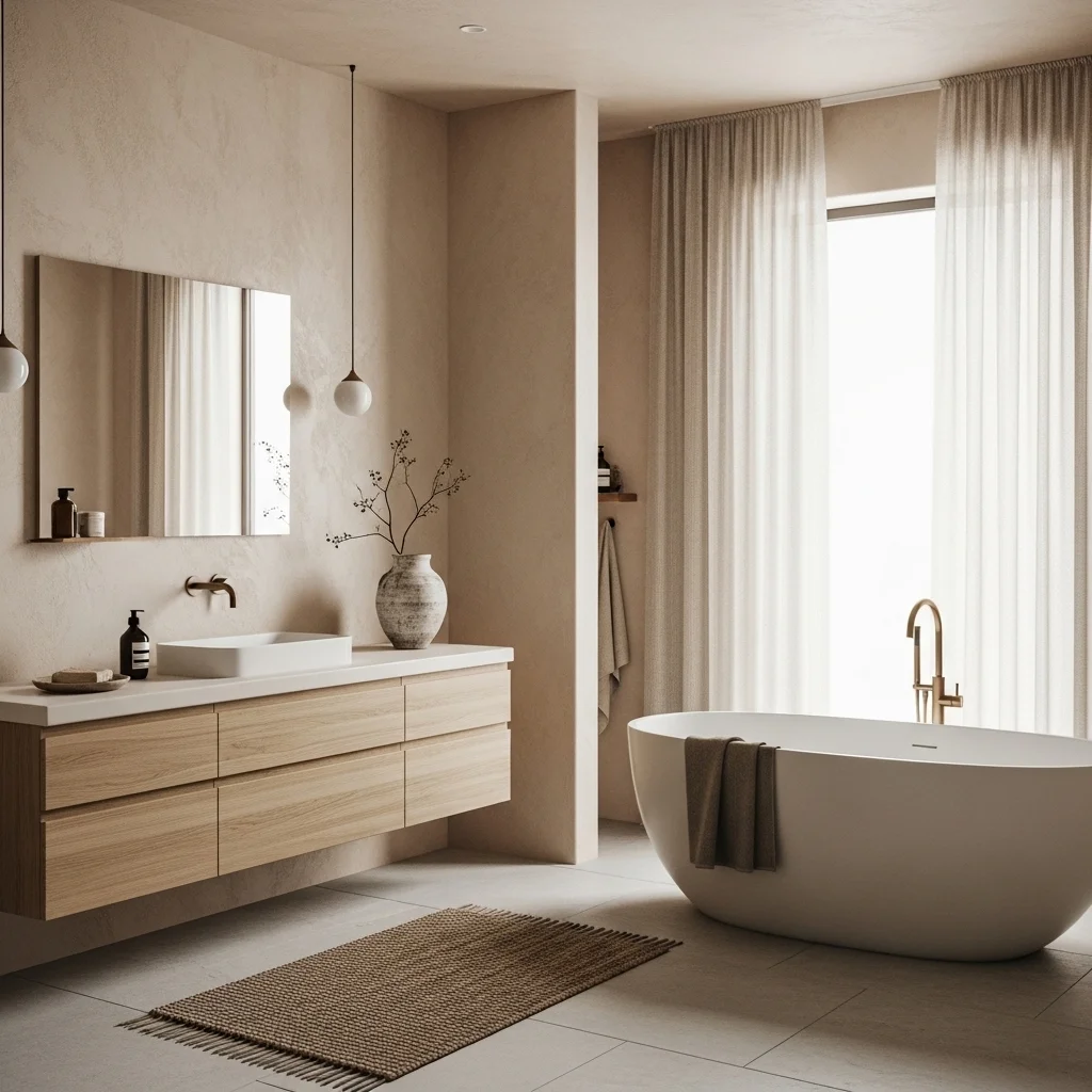 Textiles provide comfort and warmth in a Japandi bathroom. Linen towels, cotton bath mats, and woven baskets in muted tones enhance the sensory experience while maintaining the minimal aesthetic. Choose fabrics with subtle textures rather than bold patterns. This layering of soft textures contrasts with hard surfaces like stone and wood, creating balance and inviting touch.