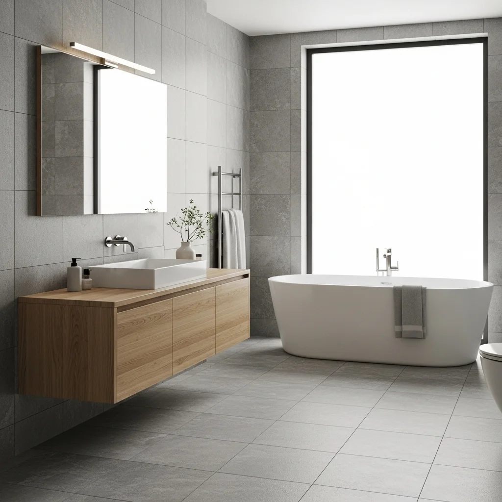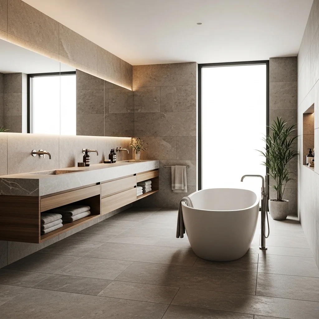 Large format tiles reduce grout lines and create a smoother, more seamless appearance. This helps to visually expand the space, making small bathrooms appear larger. Stone or porcelain tiles in soft, neutral shades work particularly well. Large tiles also emphasize simplicity and provide a clean backdrop for other elements, such as wooden vanities or freestanding tubs, enhancing the Japandi aesthetic.