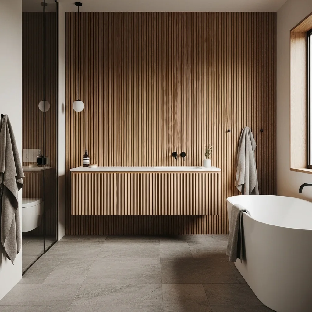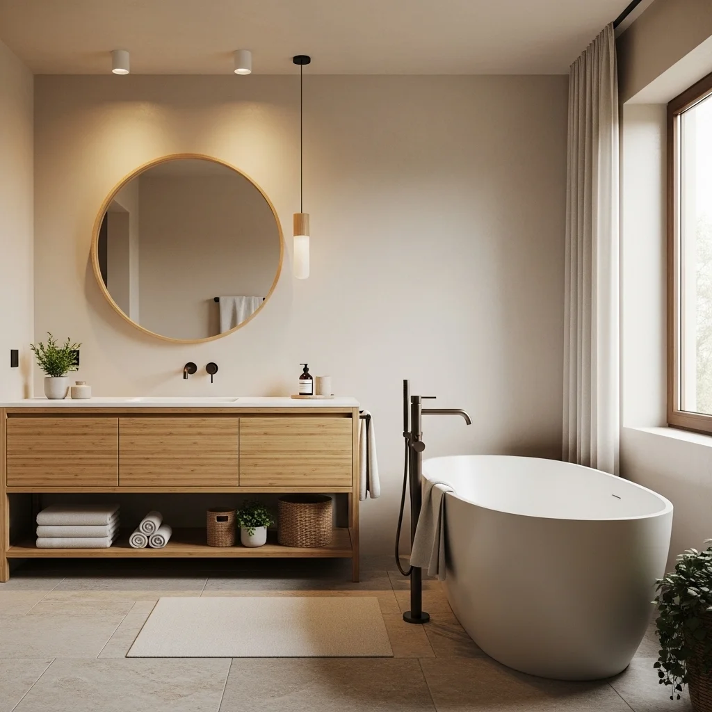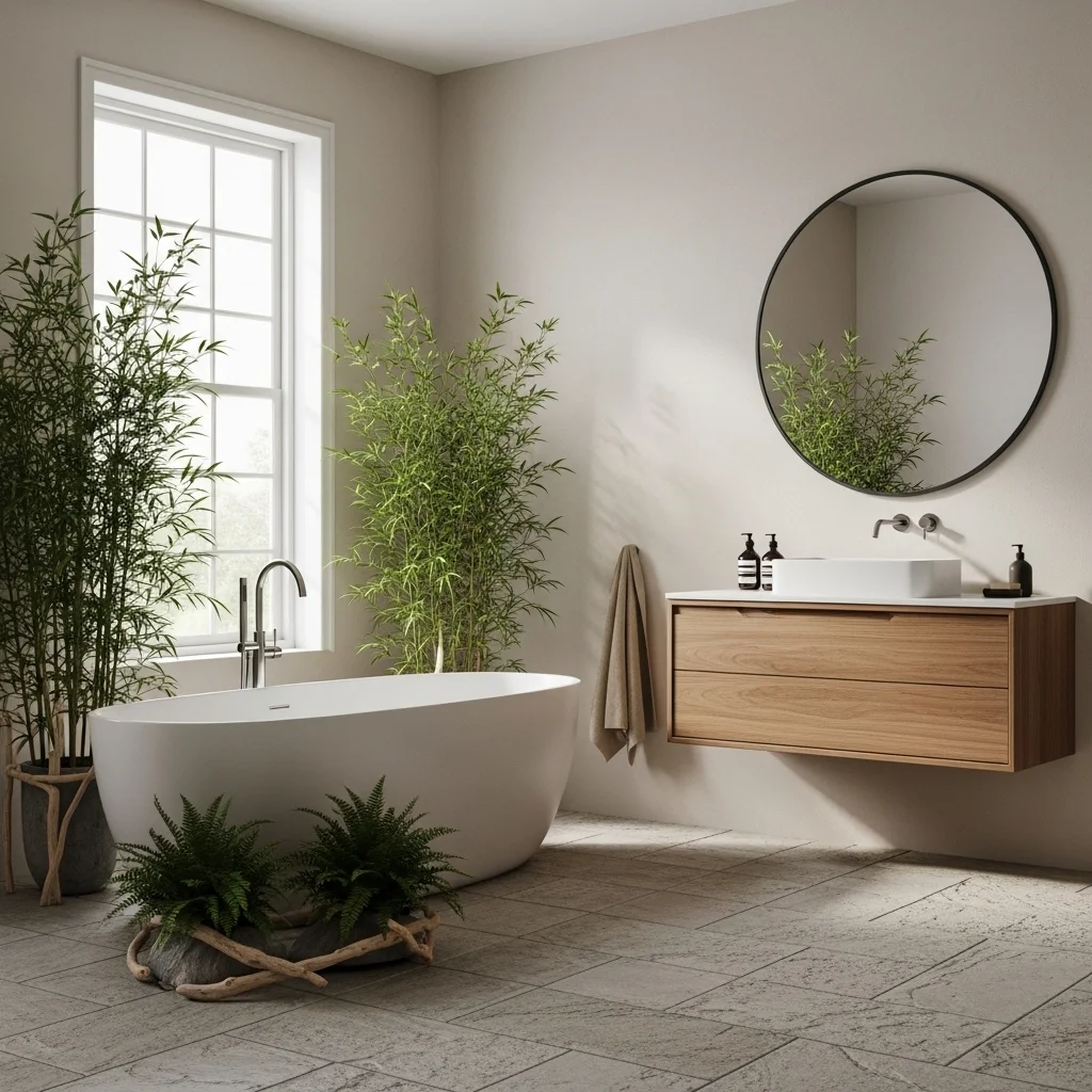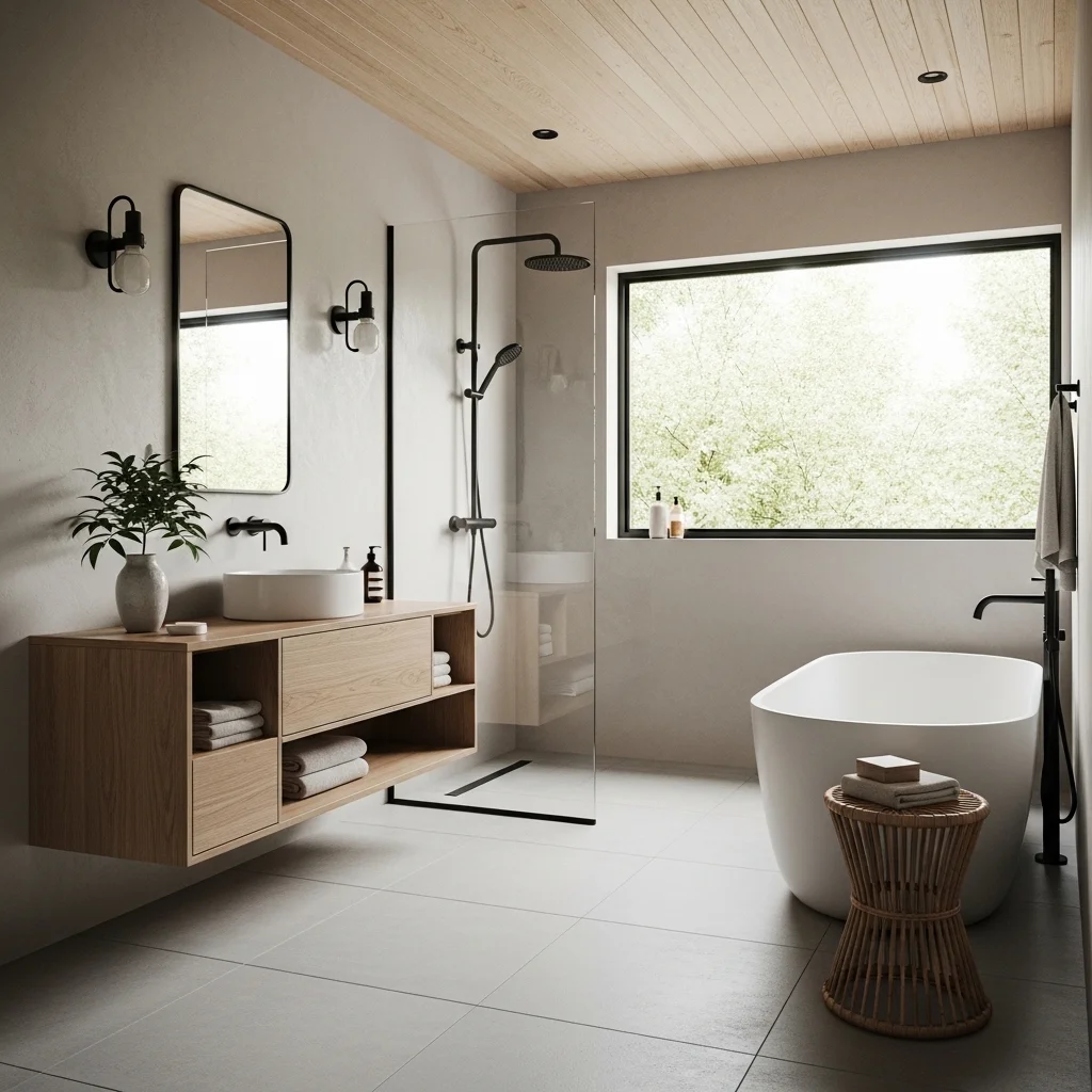 Wood is fundamental to Japandi aesthetics, providing warmth and texture in an otherwise minimal setting. Light oak, ash, or bamboo are ideal choices. Vanities, shelving, and ceiling accents made from natural wood instantly create a sense of comfort and sophistication. Wood not only enhances the visual appeal but also connects the space to nature, a central tenet of Japanese design. To ensure durability in humid bathroom conditions, always select treated or water-resistant wood finishes. Integrating wooden accents around mirrors or as floorboards can soften hard surfaces like stone or concrete, balancing the space.