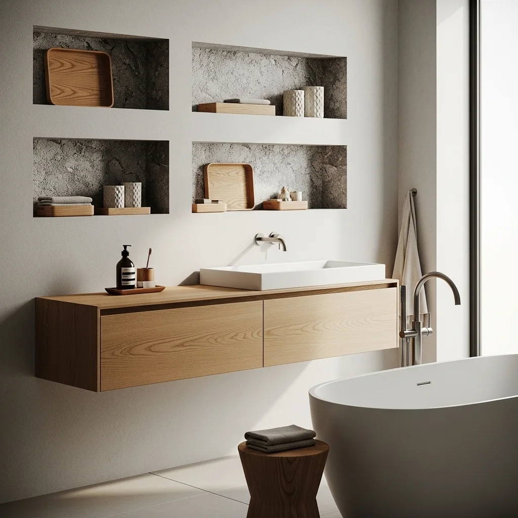 Recessed storage niches in the shower or above the vanity provide functional storage without cluttering the space. These niches keep toiletries organized and maintain the clean, minimalist aesthetic. Using the same tile or plaster material as the surrounding walls creates a seamless look. For a personal touch, add wooden trays or small ceramic containers in the niches for soap, lotions, or decorative accents.