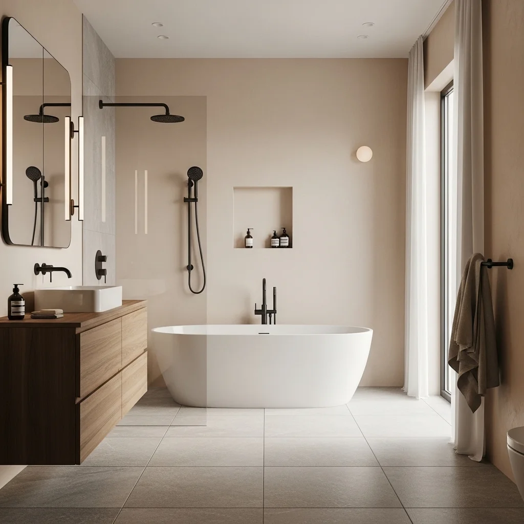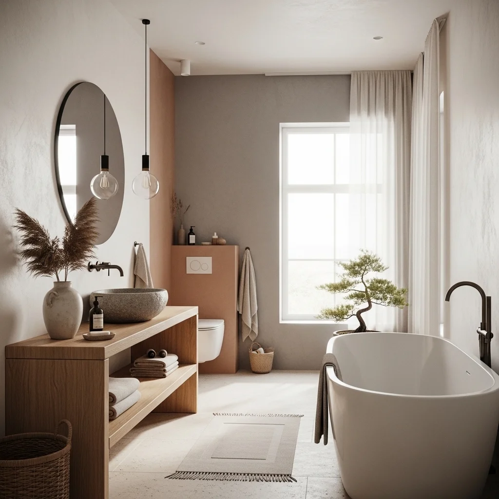 Color sets the emotional tone of any space. In Japandi bathrooms, soft neutral hues dominate, creating a calming atmosphere. Think warm whites, creamy beiges, soft taupes, and gentle grays. Using a consistent palette across walls, tiles, cabinetry, and textiles ensures visual cohesion. Subtle tonal variations rather than sharp contrasts provide depth without visual chaos. For instance, pairing a light beige wall with a slightly darker taupe floor creates understated layers that make the space feel warm and inviting. Neutral tones also allow natural wood and stone elements to take center stage, reinforcing the connection to nature, a key principle of Japandi design.