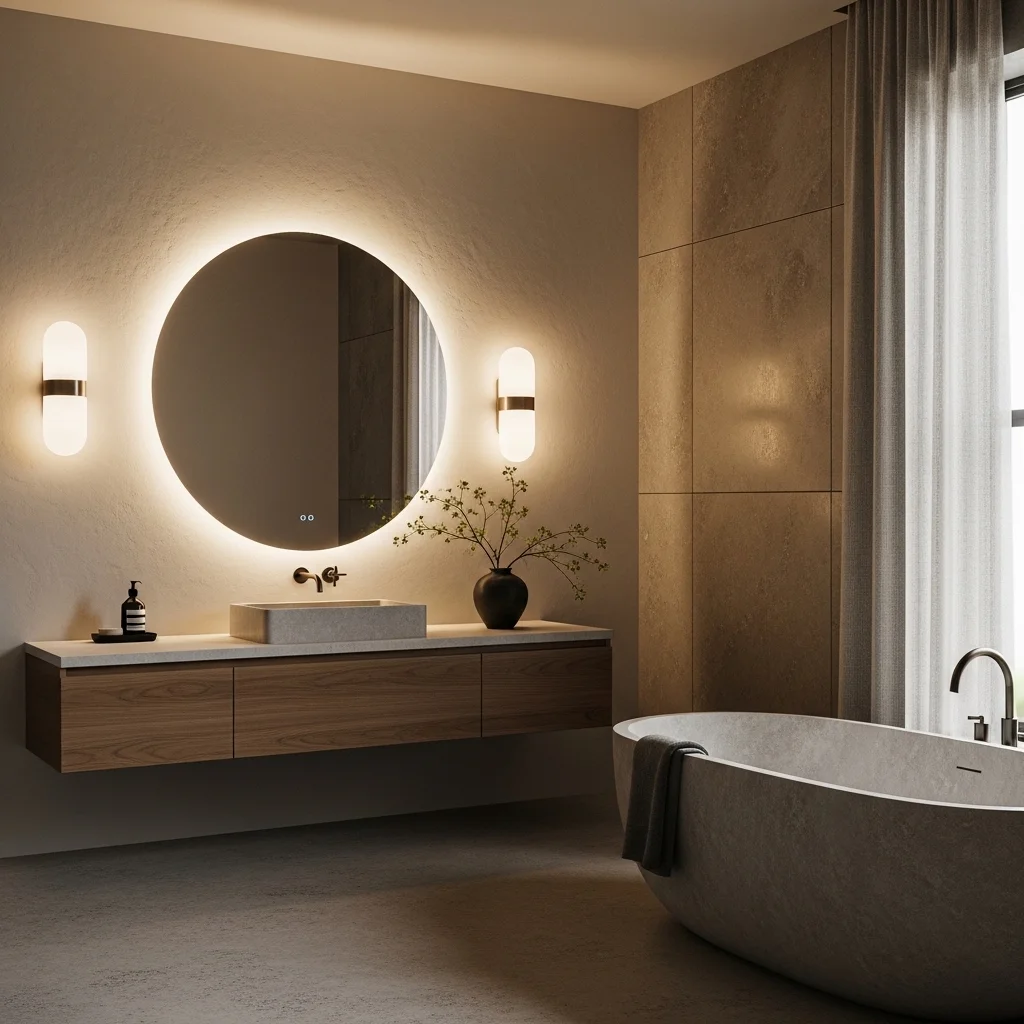 Lighting should be soft, layered, and ambient. Avoid harsh overhead fixtures in favor of a combination of ceiling lights, wall sconces, and backlit mirrors. Warm LED lights complement natural materials and create a spa-like atmosphere. Dimmer switches can adjust the mood, providing brighter illumination for practical tasks and softer light for relaxation. Lighting is not only functional but also central to cultivating serenity in a Japandi bathroom.