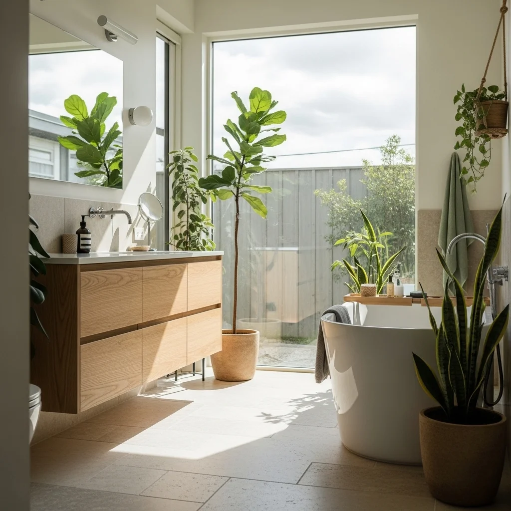 Plants add life, color, and a connection to nature. Bamboo, ferns, and snake plants thrive in humid conditions and require minimal maintenance. Place them near windows, on shelves, or in corners to soften hard surfaces and create a calming visual rhythm. Natural greenery reinforces Japandi principles by bridging the gap between indoor and outdoor spaces.