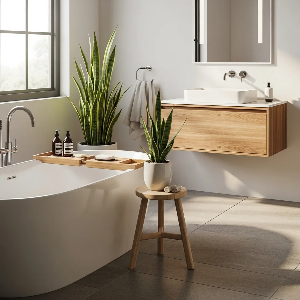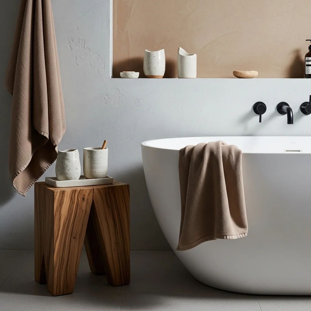 Incorporate a small wooden stool or bench near the tub to encourage slow, mindful bathing. This functional addition allows you to sit comfortably, place bath accessories, or simply pause and enjoy the serene environment. A dedicated relaxation corner reinforces the Japandi focus on intentional living and mindful moments within your daily routine.
