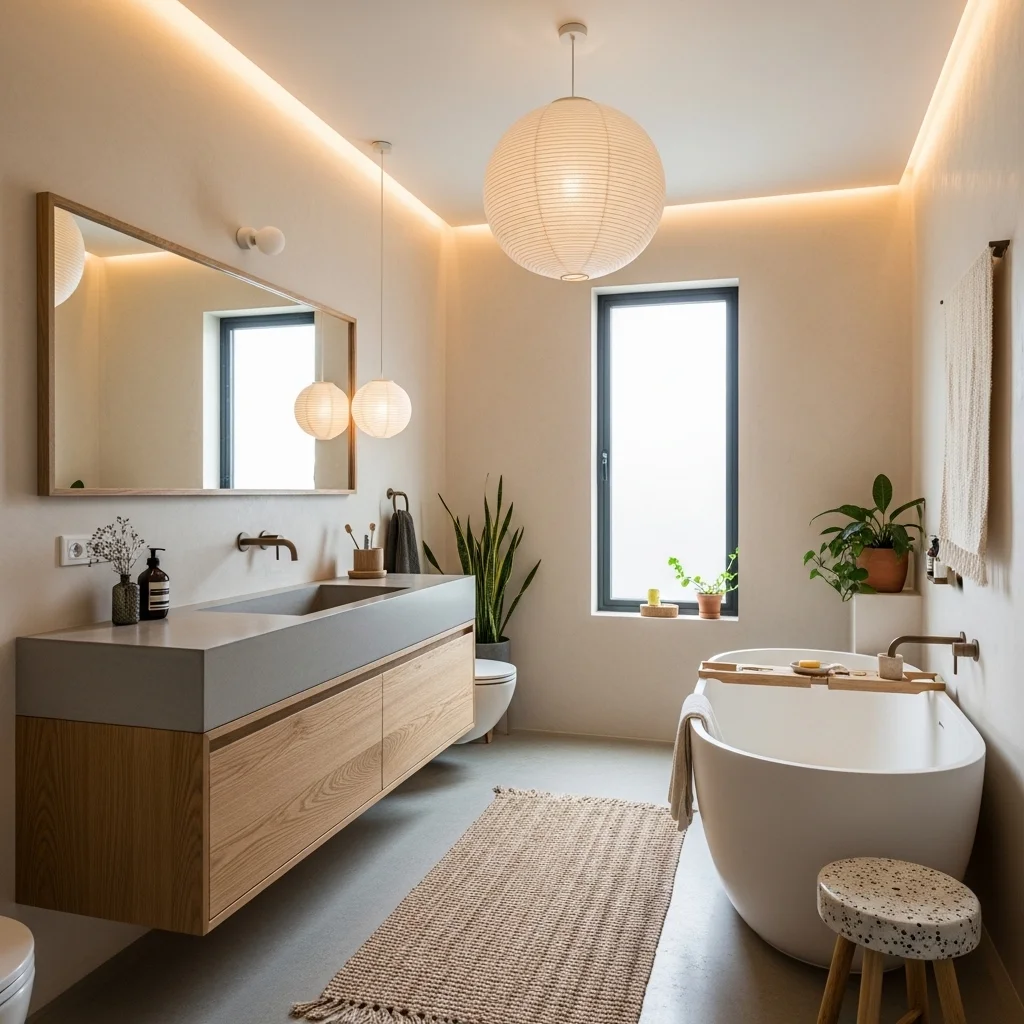 Natural light is essential in Japandi bathrooms. Windows, skylights, or frosted glass panels allow daylight to flood the space, highlighting the textures of wood, stone, and plaster. Daylight also improves mood and helps regulate circadian rhythms, contributing to a restorative environment. For privacy, consider translucent blinds or shoji-style screens that diffuse light gently without blocking it entirely.