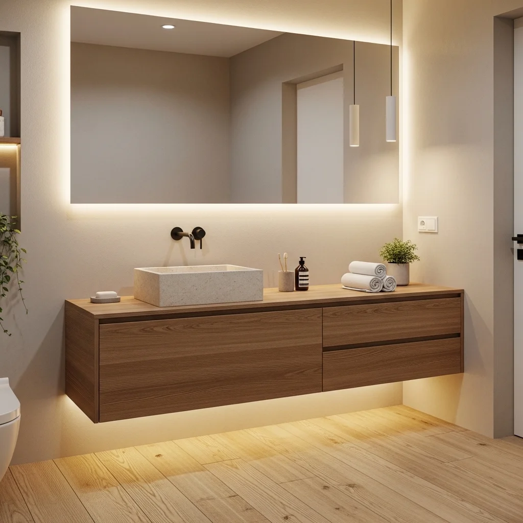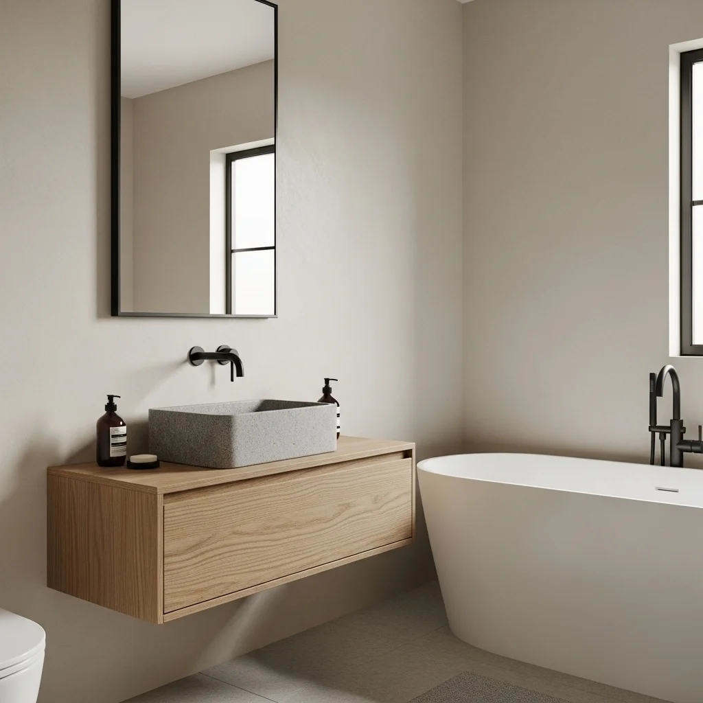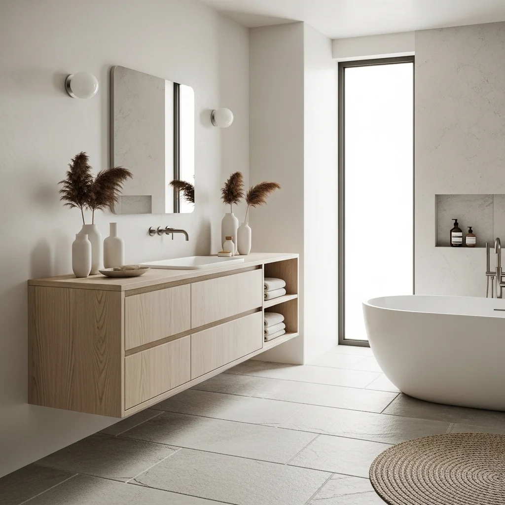 Floating vanities are essential in Japandi bathrooms because they create an airy, uncluttered look. By lifting cabinetry off the floor, they make the bathroom feel more spacious and facilitate cleaning. Select vanities with clean lines, handle-free drawers, and natural wood finishes to emphasize minimalism. Adding a stone vessel sink on top introduces texture contrast while maintaining simplicity. In small bathrooms, floating vanities prevent visual congestion, making the space appear larger than it actually is.