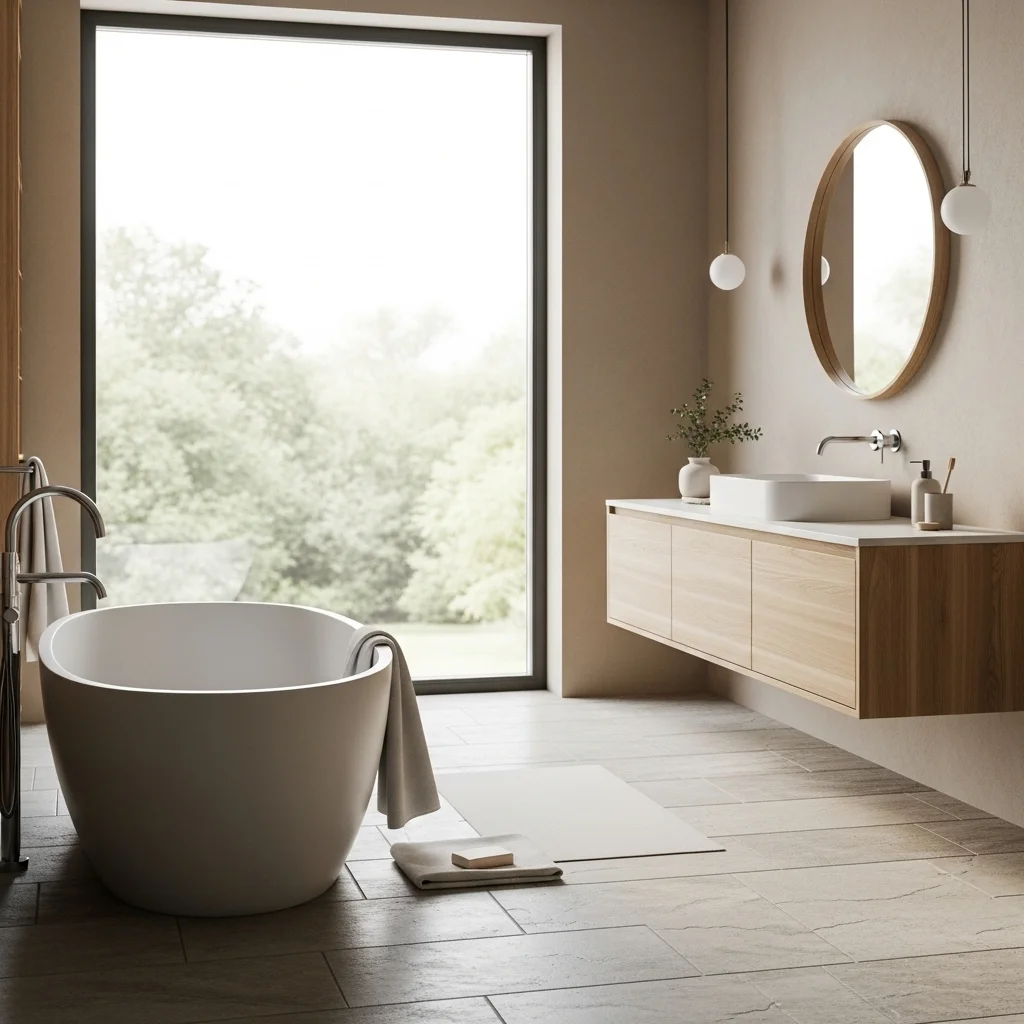 The freestanding soaking tub is a hallmark of Japandi bathrooms. More than just a functional element, it serves as a focal point and a symbol of mindful bathing. Choose a simple, sculptural design in matte white, stone, or a natural ceramic finish. Placing the tub near a window enhances the connection to the outdoors and allows natural light to illuminate the space. For smaller bathrooms, consider compact freestanding tubs or minimalist Japanese ofuro-inspired designs that maintain the meditative essence without overwhelming the room.